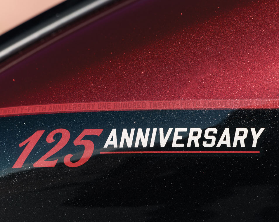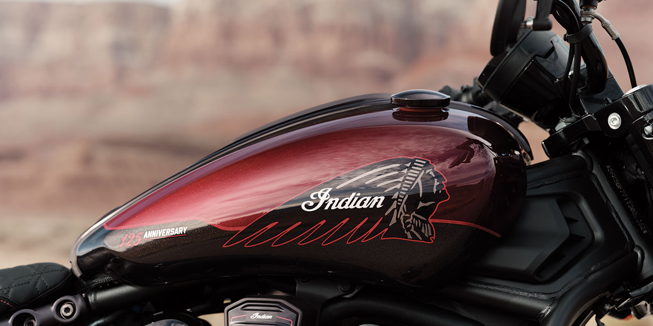 Scout Bobber 125th Anniversary Edition reducerar körupplevelsen till sina råaste uttryck. Motorcykelns aggressiva stuk och klassiska bobberdesign pryds av noggrant handmålade detaljer och 125-årsjubileumsmärken överallt.