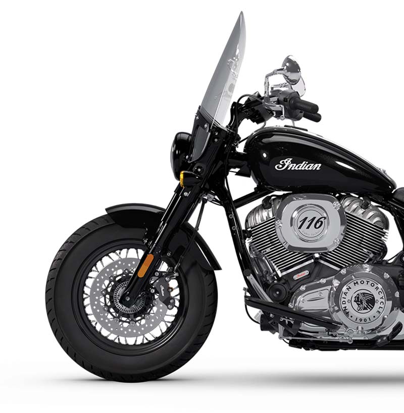 Heltsvart eller kromad premiumfinish, gaffelskydd, trådekerfälgar, en stor lykta med nacellekåpa, liksom ikoniska Indian Motorcycle-dekaler på tanken, ropar efter uppmärksamhet var du än kör.
